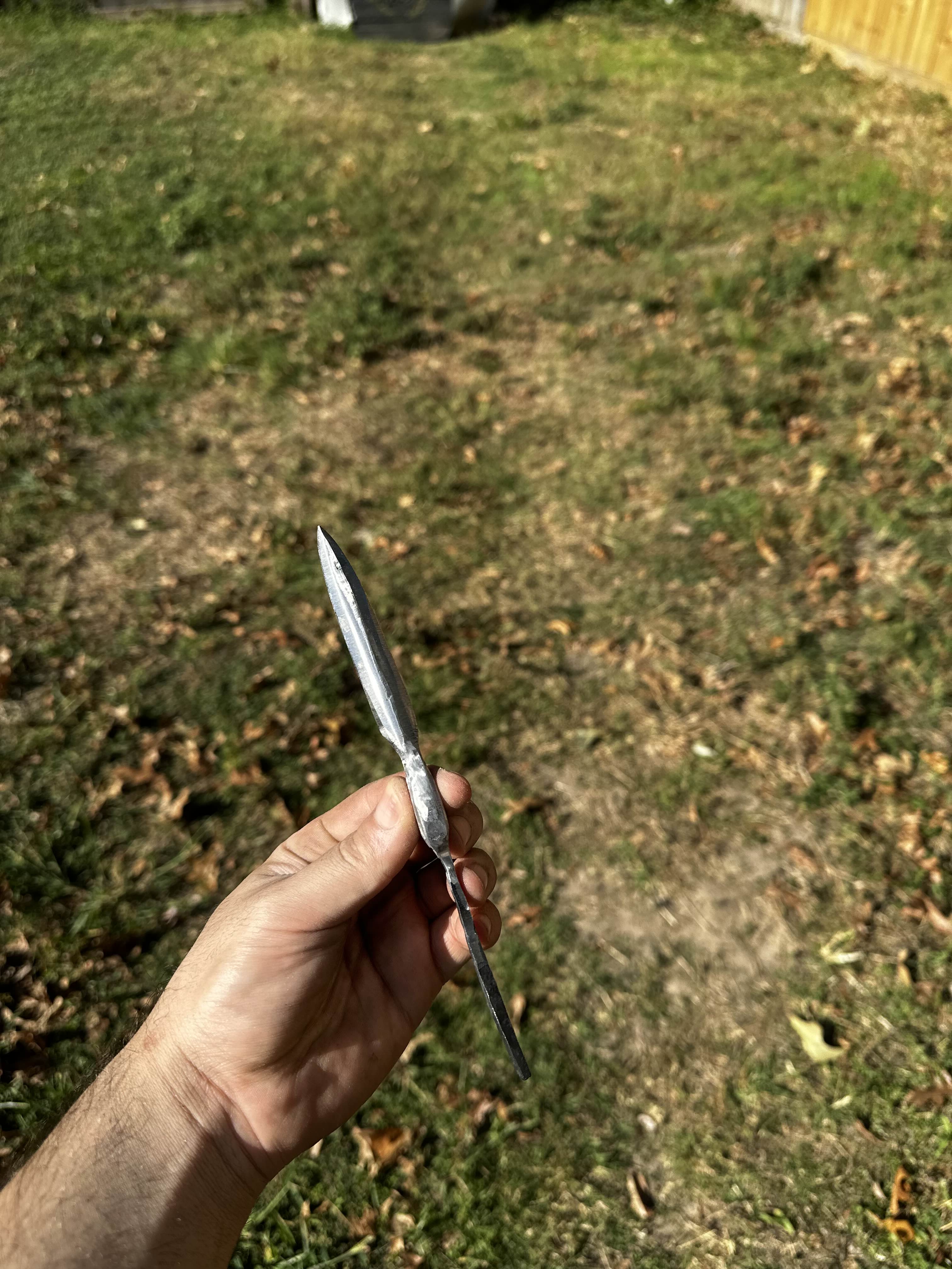 Hand forged arrowhead based on historical designs from the Ming dynasty, designed for penetrating armor. Made from 1045 medium carbon steel and heat treated as was common in historical Ming arrowheads.